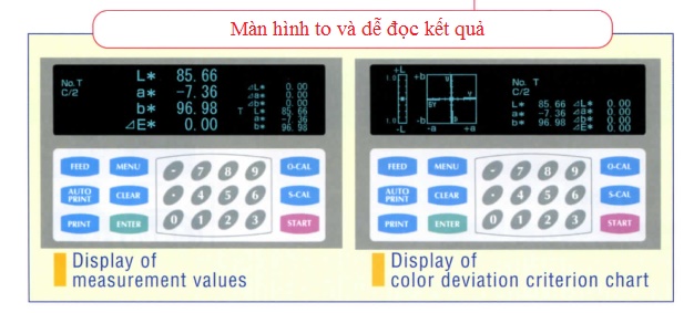 | Thông số hiển thị | L*a*b, ΔL*a*b, Δ E*, Lab, Δ Lab, Δ E, XYZ, Yxy, Yl(E313), Yl ( D1925), W( CIE), W( Lab), WB, HVC, L*C*H*, L*C*h*, Δ L*C*H*, Δ E94, Δ ECMC(1:1), Δ ECMC(2:1), LCh, Δ LCh, OD, Đồ thị độ lệch chuẩn của màu, |